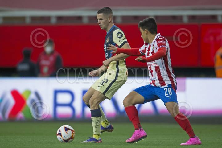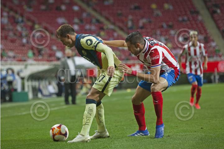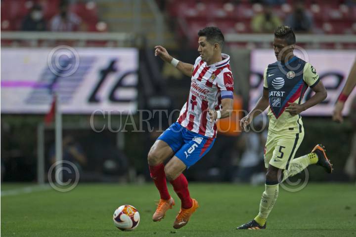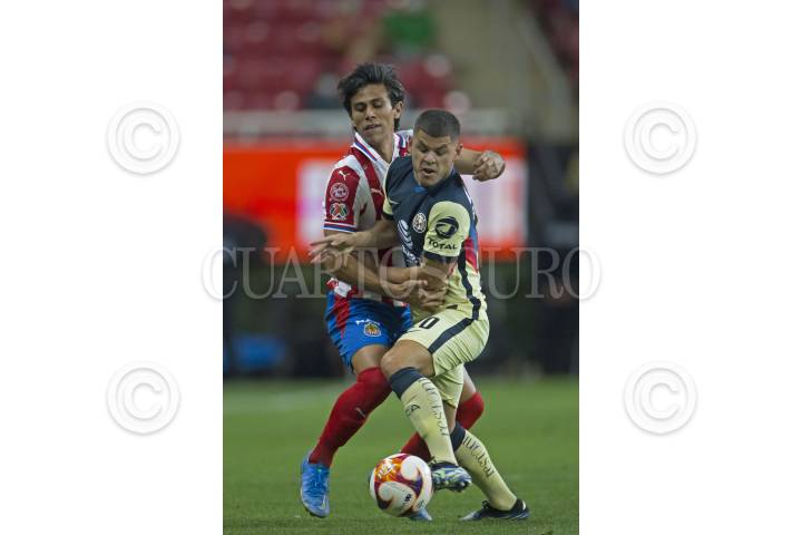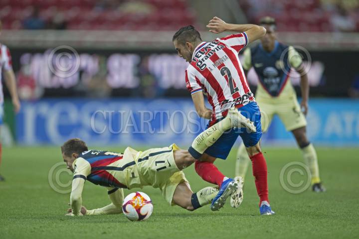 Jesús Molina Jugador de Chivas, disputa un balón ante el jugador contrario del América Pedro Aquino, esto durante el clásico nacional que se llevo a cabo en el Estadio Akron.
