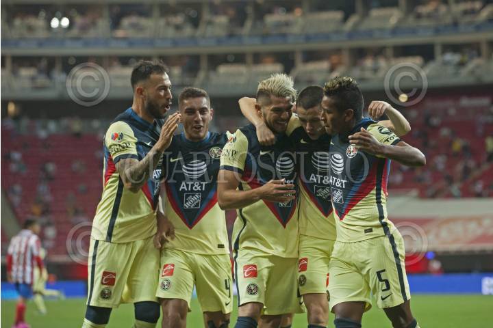 Jugadores del América festejan una de las anotaciones, esto durante el clásico nacional que se llevo a cabo en el Estadio Akron.