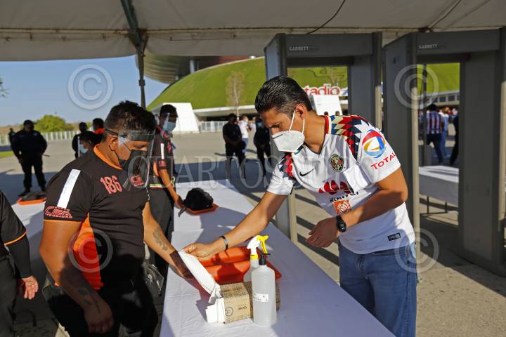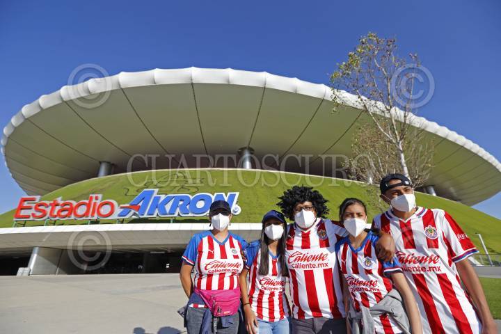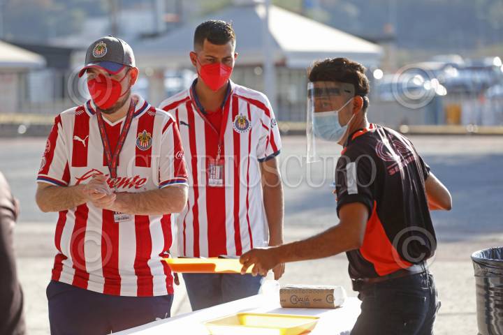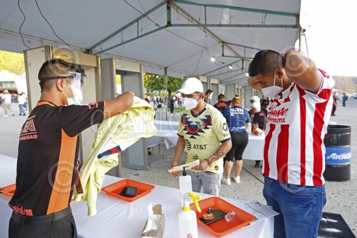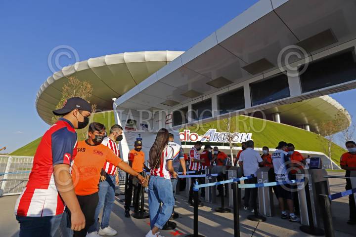 Aficionados del Club Chivas y del Club América, durante la entrada al estadio Akron, después de un gran receso de los estadios por la Pandemia Sanitaria del Covid-19.