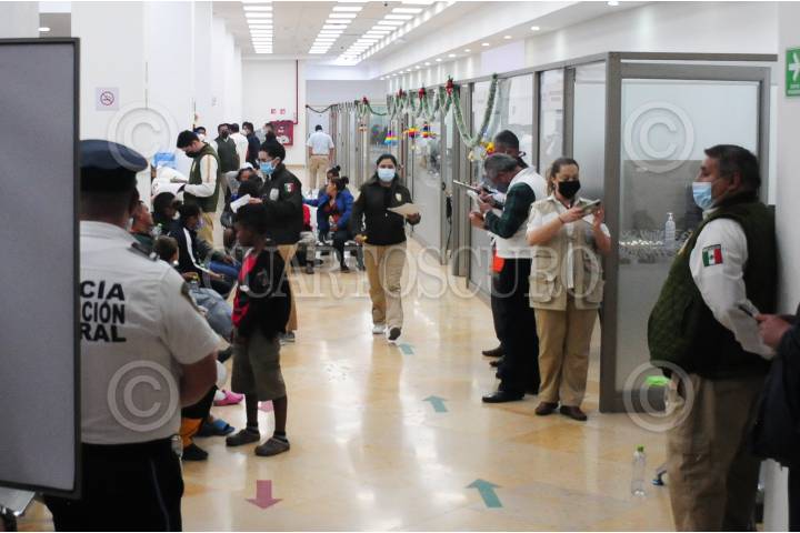 Migrantes esperan afuera de las instalaciones del INM pata poder ingresar a tramitar su tarjeta de visitante.