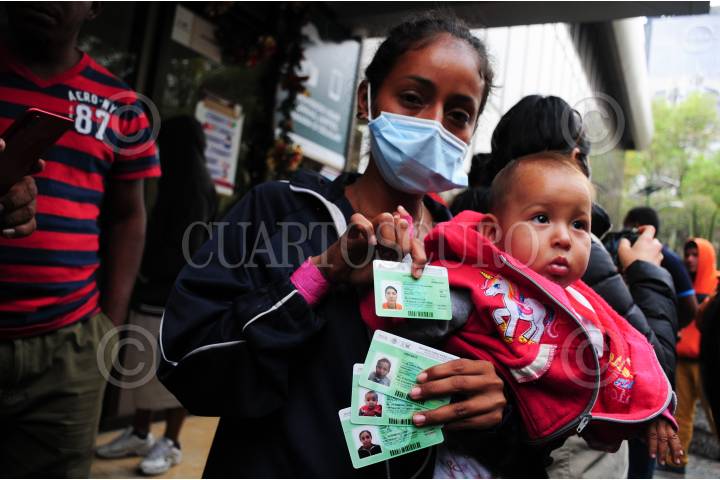Rubí López, migrante proveniente de Honduras, sale de las instalaciones del INM luego de que este instituto le otorgará su tarjeta de visitante por razones humanitarias, con la cual buscará llegar e instalarse en Coahuila junto con sus dos hijos y su esposo.