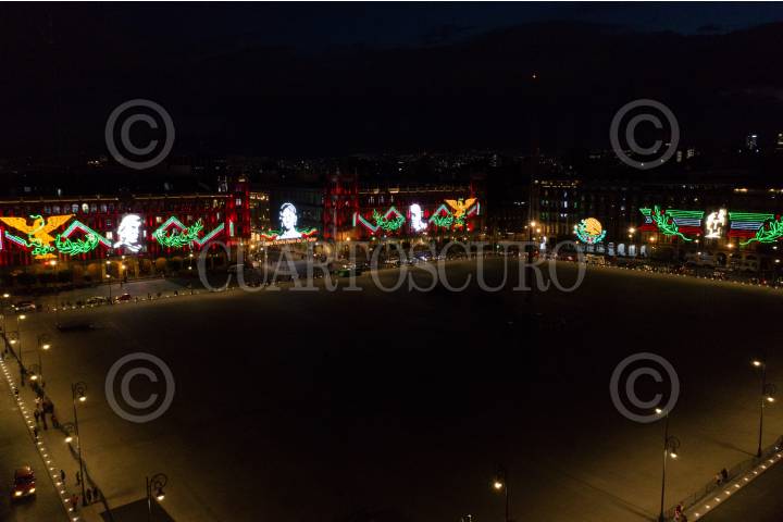 Tomas aéreas de la luminaria con motivo de las fiestas patrias encendidas en el Zócalo capitalino.