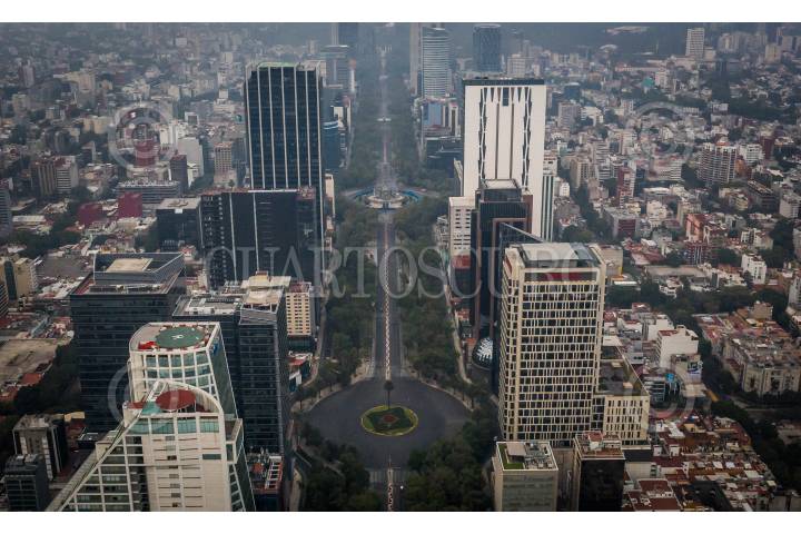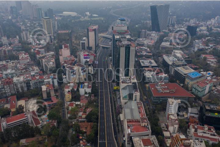 Vista aérea de avenida Paseo de la Reforma que presenta mínima presencia vehicular durante la mañana del día festivo por navidad.
