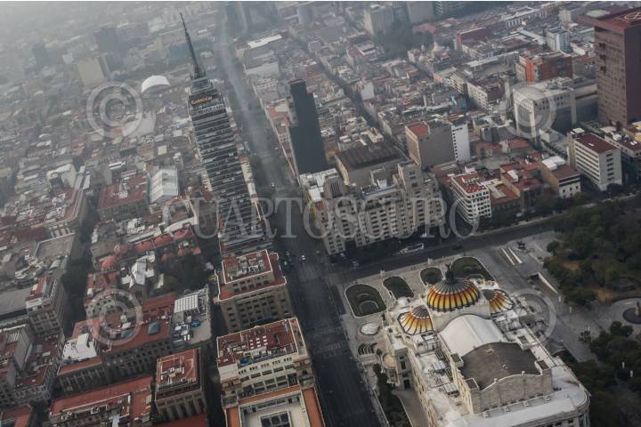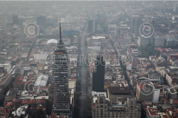 Vista aérea de Eje Central Lázaro Cárdenas y avenida Juárez que presentan mínima presencia vehicular durante la mañana del día festivo por navidad.