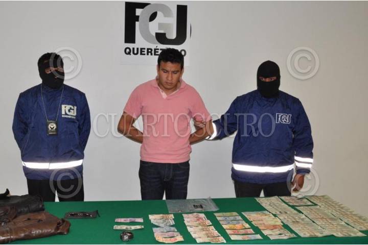 QUERETARO, QUERETARO. 26OCTUBRE2011.- Jhon Jairo Garay Castro, de nacionalidad venezolana, es señalado como probable responsable del robo de la habitación del cantante venezolano Franco de Vita por la Procuraduría General de Justicia de Querétaro. Entre lo extraído de la habitación se cuenta: disposición del Ministerio Público los siguientes objetos y dinero en efectivo: mil 601 dólares americanos, 280 euros, mil 181 pesos mexicanos, 2 pesos argentinos, 33 reales brasileños, 5 mil pesos colombianos, 2 quetzales guatemaltecos, 400 pesos de República Dominicana; un reloj de pulso marca Mulco Watch, unos lentes para sol y dos chamarra para caballero, los cuales estaban en posesión del inculpado al momento de su detención. FOTO: ESPECIAL/CUARTOSCURO.COM