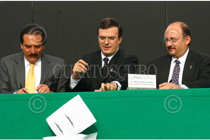 MÉXICO,D,F.,19SEPTIEMBRE2007.- Elias Moreno Secretario de Protecciòn Civil,Marcelo Ebrard Jefe de Gobierno del Distrito Federal, y Antonio Revah Director General de INVI,firman un convenio para el mejoramiento y entrega de viviendas. FOTO:SASHENKA GUTIERREZ/CUARTOSCURO.COM