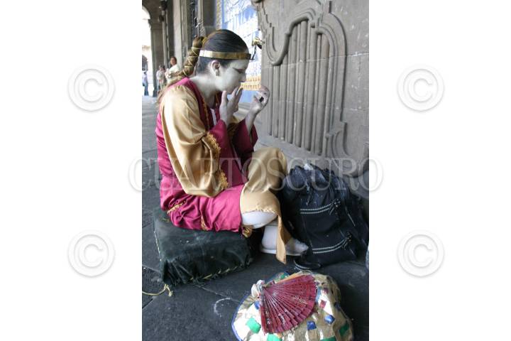 MÉXICO, D.F., 01MARZO2007.- Una mujer que trabaja como estatua viviente se retoca el maquillaje antes de comenzar su jornada laboral. FOTO: MOISÉS PABLO/CUARTOSCURO.COM