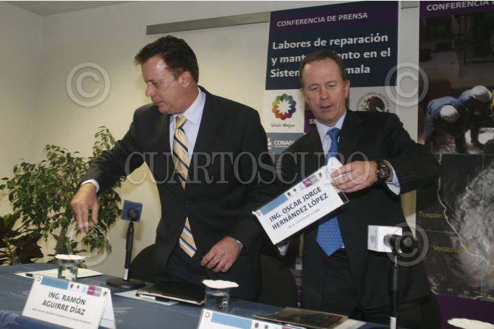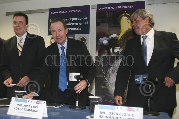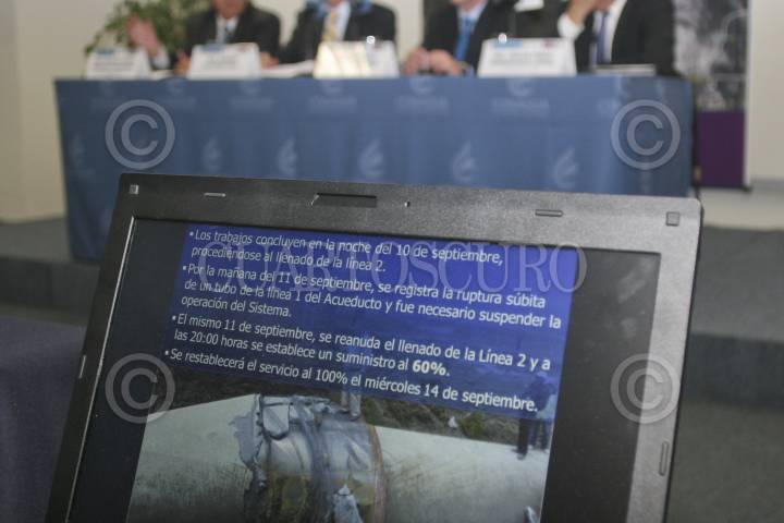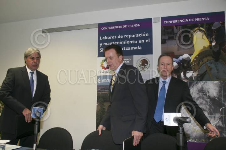 MÉXICO, D.F., 12SEPTIEMBRE2011.- Ramón Aguirre Díaz, Director General del Sistema de Aguas de la Ciudad de México, José Luis Lueje Tamargo, titular de CONAGUA y Oscar Jorge Hernández, vocal ejecutivo de la CAEM, en conferencia de prensa llamaron a la comprensión para que habitantes del DF y zona metropolitana reduzcan el consumo del agua en los próximos dos días hasta que se restablezca por completo el suministro programado para la madrugada del jueves debido a la reparación de la tubería del sistema Cutzamala. FOTO: SAÚL LÓPEZ/CUARTOSCURO.COM