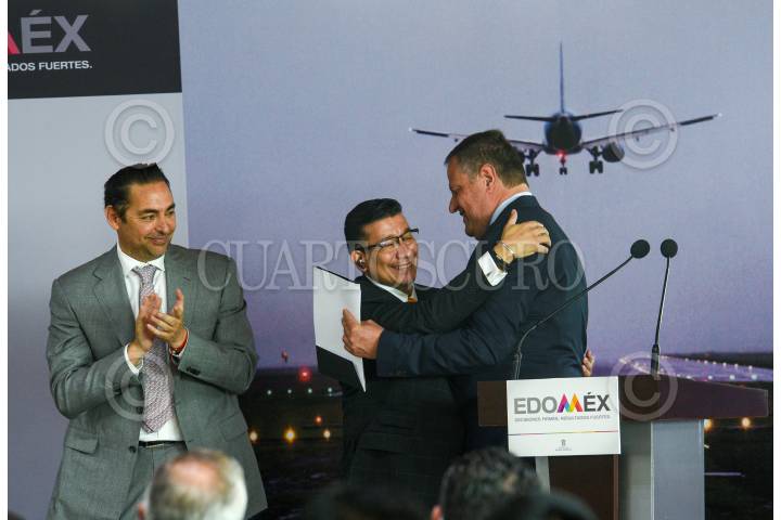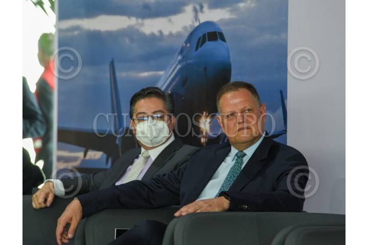 Javier Enrique Beltranena Mejicano director general de Volaris y Hugo Alberto Delgado Ortega director general del AIT, siendo Volaris la primera aerolínea comercial en reactivar sus vuelos en el Aeropuerto Internacional de Toluca (AIT).