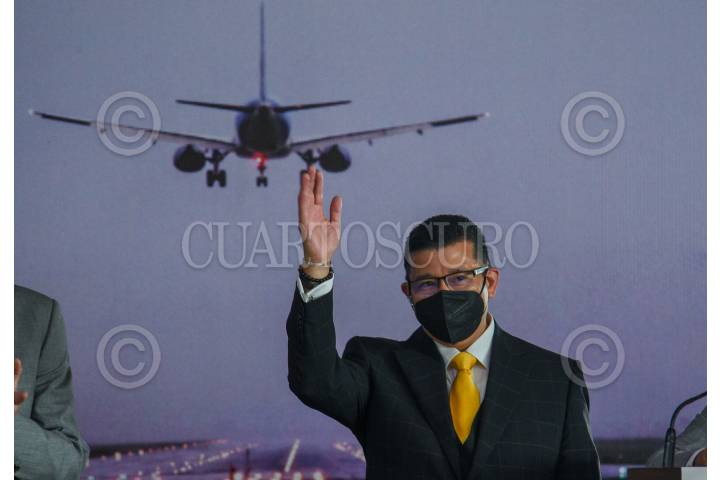 Hugo Alberto Delgado Ortega director general del AIT, durante la reactivación de vuelos comerciales en el Aeropuerto Internacional de Toluca, siendo Volaris primera aerolínea comercial en regresar a este espacio aeroportuario.