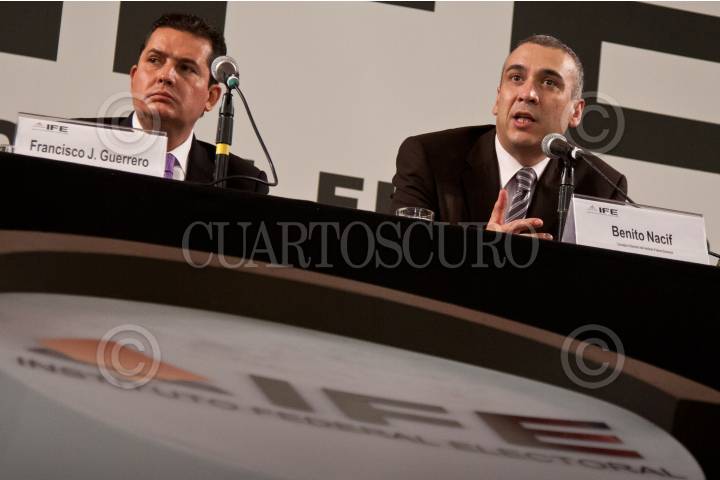 MÉXICO, D.F., 30JUNIO2012.- Francisco J. Guerrero y Benito Nacif, consejeros del Instituto Federal Electoral; informaron en conferencia de prensa de la recepción de 40 mil 737 sobres postales con el sufragio en el extranjero para elegir a Presidente de la República, lo cual, representa un incremento del 23 por ciento respecto de la elección del 2006. FOTO: ADOLFO VLADIMIR /CUARTOSCURO.COM