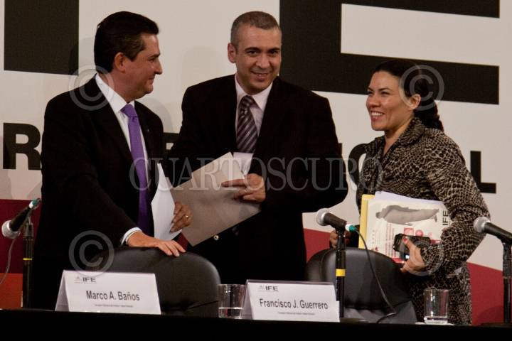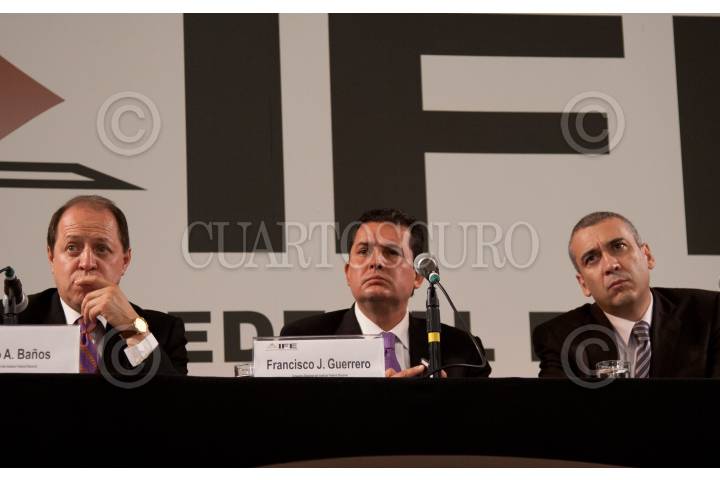 MÉXICO, D.F., 30JUNIO2012.- Marco Antonio Baños, Francisco J. Guerrero y Benito Nacif, consejeros del Instituto Federal Electoral; informaron en conferencia de prensa de la recepción de 40 mil 737 sobres postales con el sufragio en el extranjero para elegir a Presidente de la República, lo cual, representa un incremento del 23 por ciento respecto de la elección del 2006. FOTO: ADOLFO VLADIMIR /CUARTOSCURO.COM