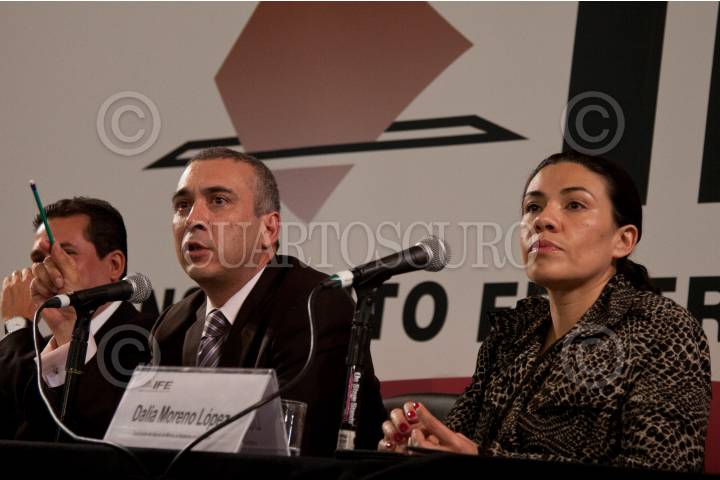 MÉXICO, D.F., 30JUNIO2012.- Francisco J. Guerrero, Benito Nacif y Dalia Moreno López, consejeros del Instituto Federal Electoral; informaron en conferencia de prensa de la recepción de 40 mil 737 sobres postales con el sufragio en el extranjero para elegir a Presidente de la República, lo cual, representa un incremento del 23 por ciento respecto de la elección del 2006. FOTO: ADOLFO VLADIMIR /CUARTOSCURO.COM
