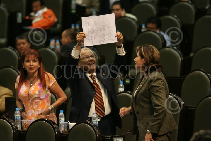 MÉXICO D.F. 14SEPIEMBRE2007.-Un diputado del Partido Convergencia levanta un cartel con la leyenda "Vuelve Zermeño te Extrañamos" durante la sesión en la Cámara de Diputados. FOTO:GUILLERMO PEREA/CUARTOSCURO.COM