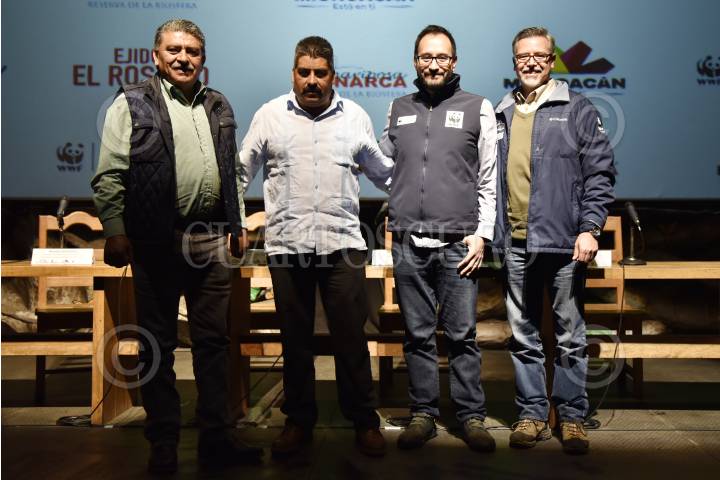 OCAMPO, MICHOACÁN, 22JULIO2017.- Ricardo Luna García, secretario de Medio Ambiente, Recursos Naturales y Cambio climático en Michoacán; Marco Linares, subdirector de Marketing Corporativo de Telcel; Jorge Rickards, director general interino de WWF México, y Homero Gómez, comisario ejidal de "El rosario", encabezaron la jornada de reforestación 2017 en el ejido "El Rosario", el cual es un lugar clave en la reserva de la biosfera mariposa monarca. En actividades de reforestación se sembraron aproximadamente 15 oyameles en donde se reunieron 850 personas entre los que se encontraban niños, jóvenes y adultos. FOTO: MARIO JASSO /CUARTOSCURO.COM