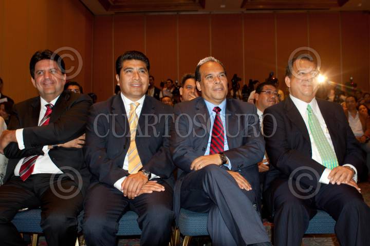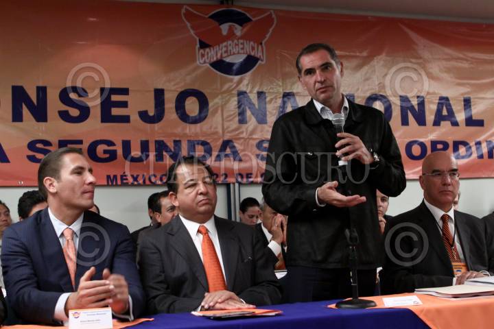 MÉXICO, D.F., 22OCTUBRE2010.- Rafael Moreno Valle, gobernador electo de Puebla; Luis Walton, dirigente nacional de Convergencia; Gabino Cue Monteagudo, gobernador electo de Oaxaca y el senador Dante Delgado durante la Vigésima Segunda Sesión Ordinaria del Consejo Nacional de Convergencia que se realizo en el World Trade Center. FOTO: RODOLFO ANGULO/CUARTOSCURO.COM