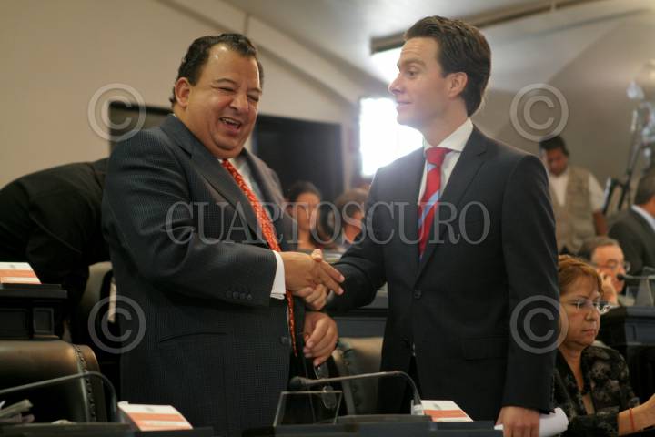 MÉXICO, D.F., 01MARZO2011.- Luis Walton Aburto, senador de Convergencia y Manuel Velasco, senador chiapaneco, durante la sesión en la Cámara de Senadores. FOTO: MOISÉS PABLO/CUARTOSCURO.COM