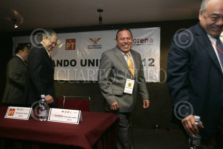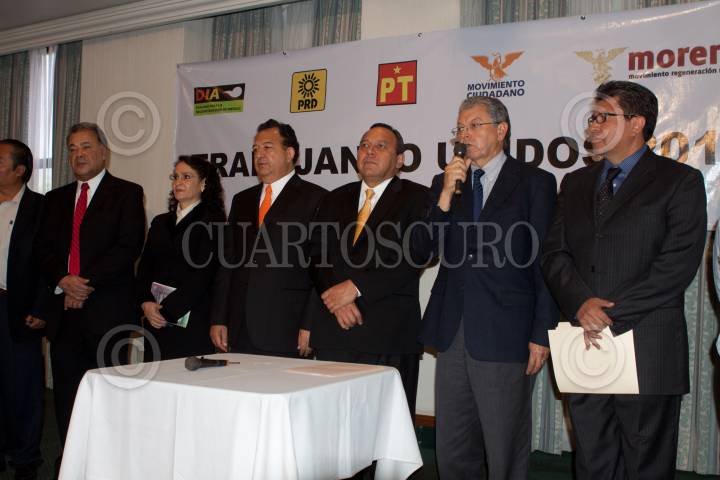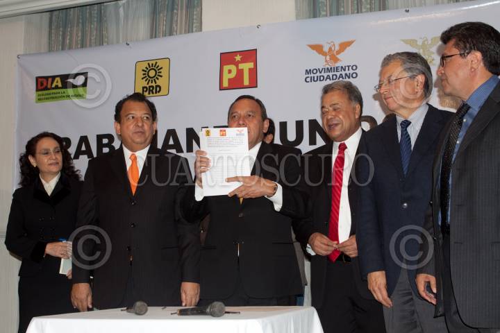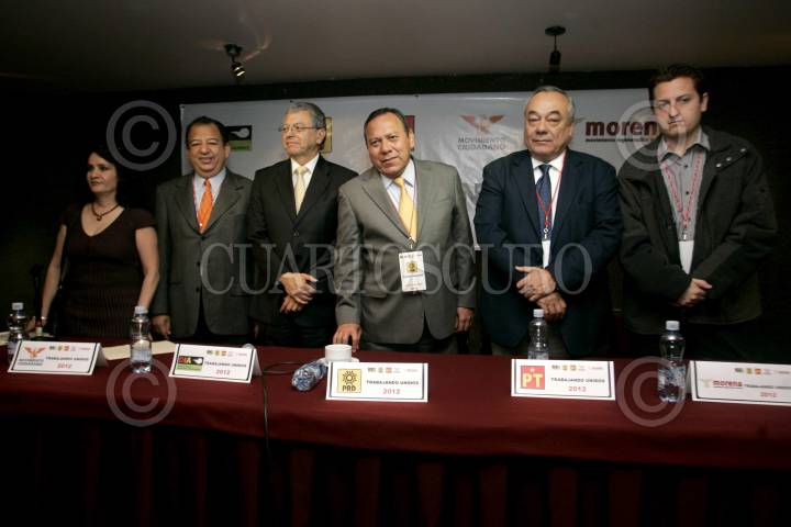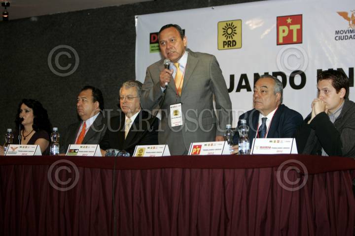 MÉXICO, D.F., 17NOVIEMBRE2011- Luis Walton Aburto, senador de Movimiento Ciudadano, Jesús Zambrano, presidente del PRD, Alfonso Anaya, dirigente del Partido del Trabajo y Ricardo Monreal, senador del Trabajo, encabezaron la firma del "Convenio de coalición electoral total que para la elección de presidente de la República, senadores y diputados por el principio de mayoría relativa, del Congreso de la Unión, celebrado por los partidos políticos nacionales de la Revolución Democrática, del Trabajo y Movimiento Ciudadano. FOTO: MOISÉS PABLO/CUARTOSCURO.COM