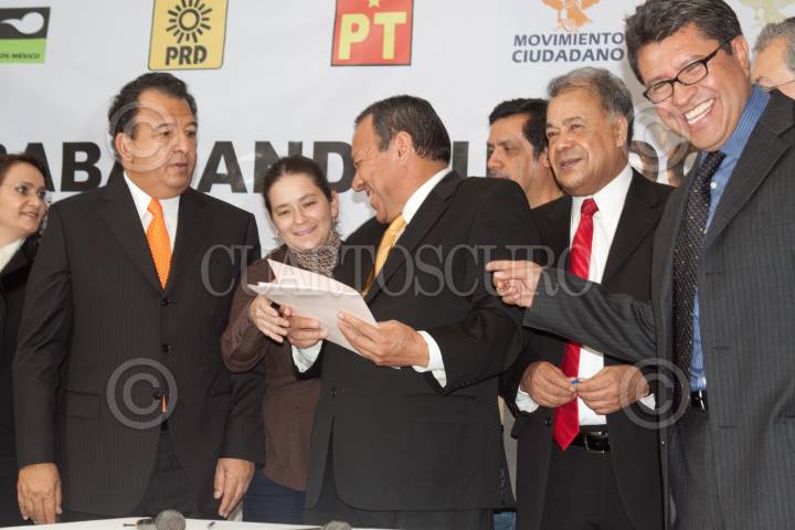 MÉXICO, D.F., 17NOVIEMBRE2011- Dolores Padierna, secretaria general el PRD, Ricardo Monreal, senador del Partido del Trabajo, Luis Walton Aburto, senador de Movimiento Ciudadano, y Jesús Zambrano, presidente del PRD, encabezaron la firma del "Convenio de coalición electoral total que para la elección de presidente de la República, senadores y diputados por el principio de mayoría relativa, del Congreso de la Unión, celebrado por los partidos políticos nacionales de la Revolución Democrática, del Trabajo y Movimiento Ciudadano. FOTO: MOISÉS PABLO/CUARTOSCURO.COM