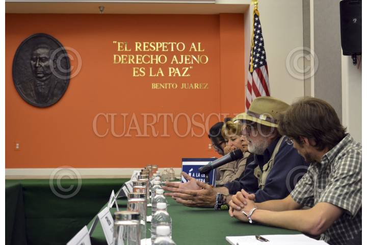 MÉXICO, D.F., 11AGOSTO2011.- Sergio Aguayo, analista político; Maureen Mayer, de la oficina en Washington para Asuntos Latinoamericanos; el poeta Javier Sicilia y el actor, Diego Luna durante el diálogo entre Organizaciones No Gubernamentales realizada en el Museo de la Tolerancia donde se leyó una carta dirigida al presidente Estadounidense, Barak Obama, donde le piden acciones que esten a su alcance para frenar el contrabando de armas hacia la República Mexicana. FOTO: GAVINO ACEVEDO/CUARTOSCURO.COM