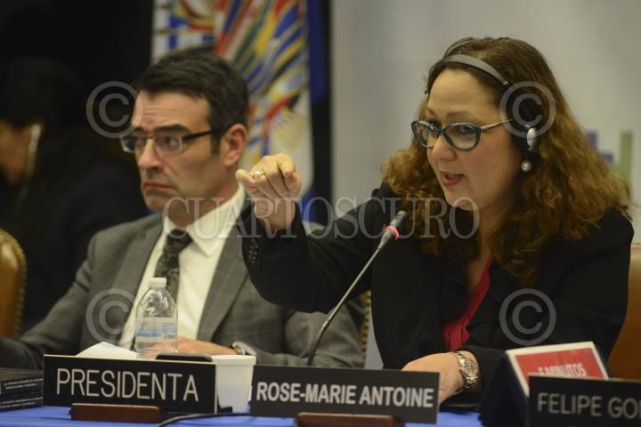 WASHINGTON, DC, ESTADOS UNIDOS, 20OCTUBRE2015.- Rose-Marie Antoine, presidenta de la Comisión Interamericana de Derechos Humanos (CIDH), presidió la audiencia por la firma de compromisos entorno al caso Ayotzinapa entre Grupo Interdisciplinario de Expertos Independientes (GIEI) y el Estado mexicano. Entre los compromisos destaca el de: "Sacar la investigación de la SEIDO de forma inmediata, proporcionando toda la información existente a un nuevo equipo de investigación en la Subprocuraduría de derechos humanos, el cual llevará la segunda parte de investigación de forma exclusiva". FOTO: CIDH /CUARTOSCURO.COM