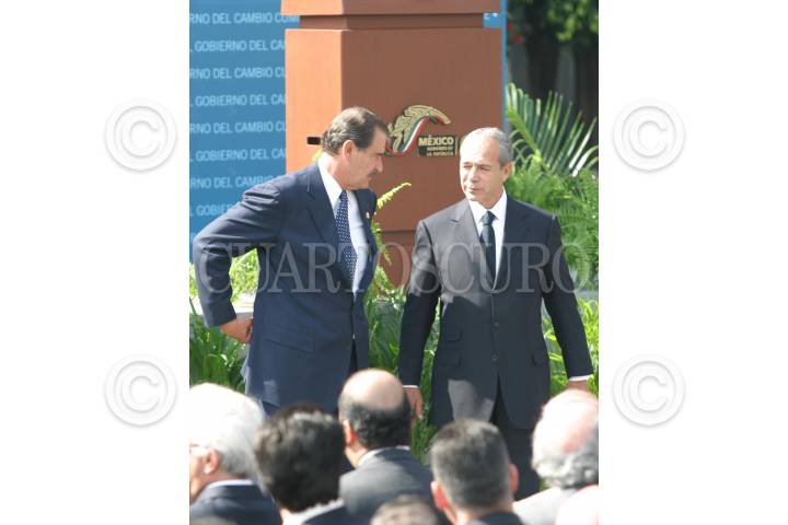 MEXICO, D.F. 02FEBRERO2005.- El presidente Vicente Fox y Pedro Cerisola y Weber, secretario de Comunicaciones y Transportes, durante la reunión de revisión de metas 2005. Evento realizado en las instalaciones de la SCT. FOTO: Sandra Perdomo/CUARTOSCURO.COM