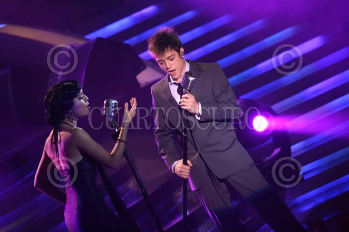 MÉXICO, D.F., 19OCTUBRE2008.- Se realizo una emision mas del reality show de los sueños sangre por sangre, en la imágen el cantante Pee Wee canta con Dulce Maria durante su participación en la emisión. FOTO: SÁSHENKA GUTIÉRREZ/CUARTOSCURO.COM