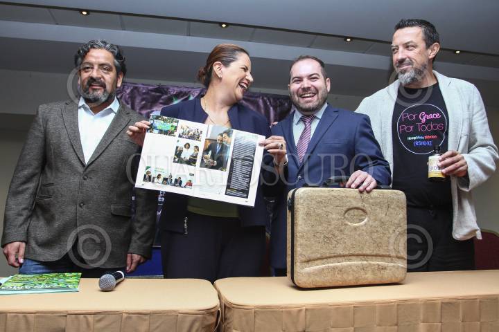 CIUDAD DE MÉXICO, 10AGOSTO2016.- Julio Zeni, coeditor de la revista Cañamo, Leopoldo Rivera, organizador de la ExpoWeed México, Martha Tagle, senadora de la república, Raúl Elizalde, de la FUndación por Grace y Dion Markgraaff, director en México de General Hemp, durante la conferencia de presentación de la ExpoWeed, Feria Internacional del Cannabis que se realizará por primera vez en el país. A partir del 12 de agosto y por 3 días, más de 30 expositores de diversos artículos derivados del cannabis y una veintena de especialistas internacionales, quienes hablarán de las últimas investigaciones científicas en torno a la misma. L a expo se realizará 12, 13 y 14 de agosto de 10 a 21 hrs en el WTC. En la imagen, Raul Elizalde muestra su portafolio hecho con Cáñamo, fibra que se obtiene de la marihuana. FOTO: ADOLFO VLADIMIR /CUARTOSCURO.COM