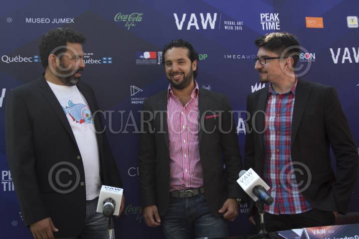 MÉXICO, D.F., 19ENERO2015.- Edgardo Bermejo, director del British Council, Pablo Brito, director de Visual Art Week 2015 y Alejandro Gutiérrez, de Colectivo Madison, dieron a conocer detalles de Festival Visual Art Week 2015 Transformando el espacio público, en Hotel Condesa. FOTO: GUILLERMO PEREA /CUARTOSCURO.COM