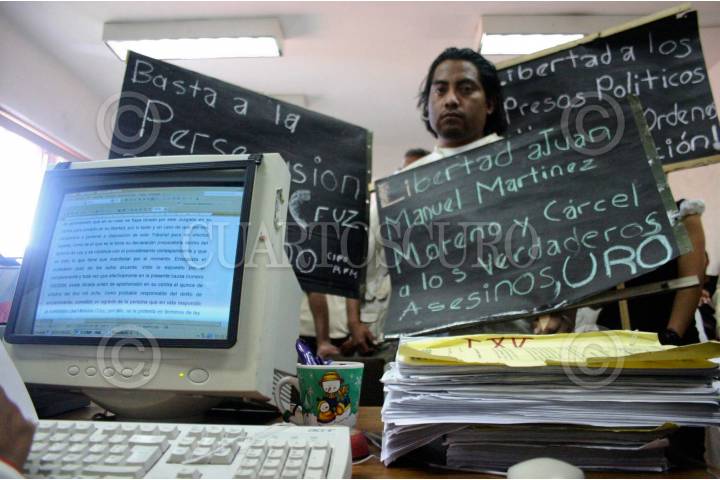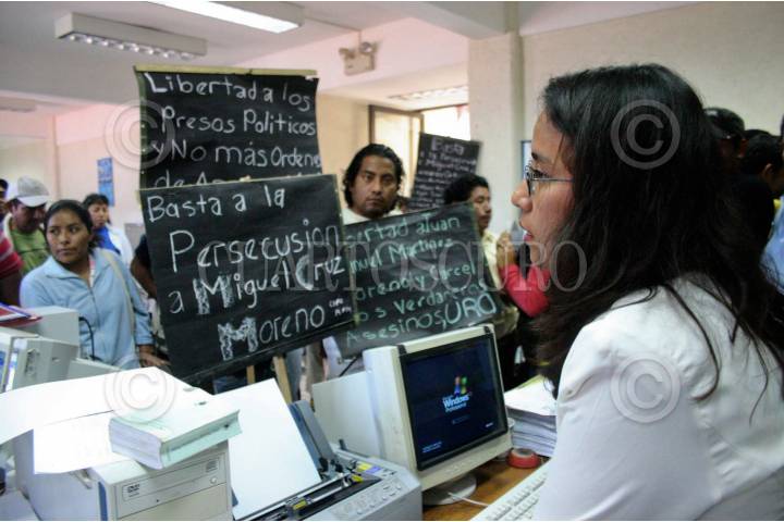 OAXACA, OAXACA, 05FEBRERO2009.- Alrededor de 200 integrantes de la APPO y el magisterio sección 22 bloquearon el juzgado 5 del Distrito en la Colonia Reforma, en protesta, a que la Procuraduría General de la República (PGR) impugnó la resolución del Juez Federal que otorgó un amparo a favor de Juan Manuel Martínez Moreno, presunto homicida del periodista Brad Will, el cual no puede alcanzar el beneficio de libertad en los próximos días. FOTO: MAX NÚÑEZ/CUARTOSCURO.COM