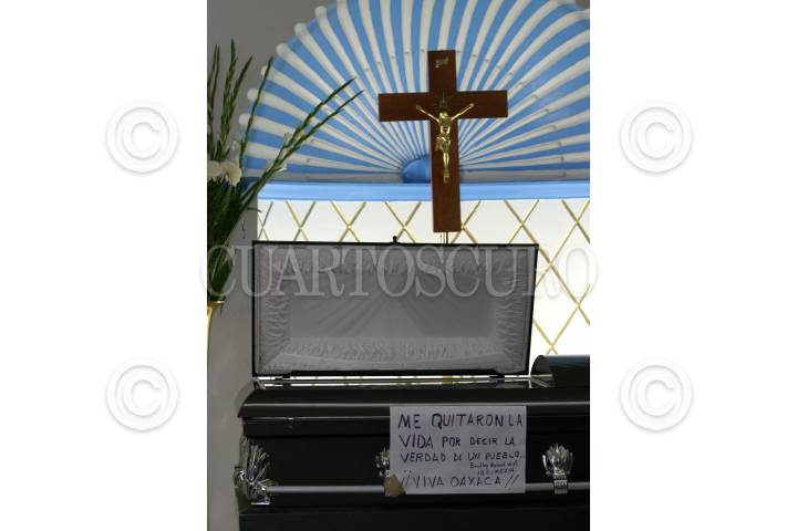 OAXACA, OAXACA, 27OCTUBRE2006.- El cuerpo del camarográfo Bradley Roland Will, quien fue asesinado en una balacera entre presuntos priistas y miembros de la APPO el día de ayer, fue velado en una funeraria del Centro Histórico por amigos y compañeros de trabajo. FOTO: MOISÉS PABLO/CUARTOSCURO.COM