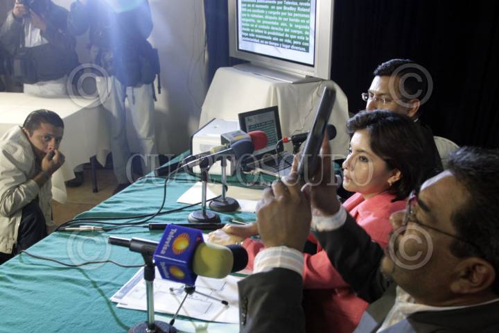 OAXACA, OAXACA 15NOVIEMBRE2006.- Lizbeht Caña, procuradora de justicia del estado y Alonso Altamirano, director de homicidios presentaron en conferencia de prensa el peritaje de las pruebas del caso del homicidio del camarografo Bradley Rolan Will. FOTO: CARLOS SALINAS ENRIQUEZ/CUARTOSCURO.COM