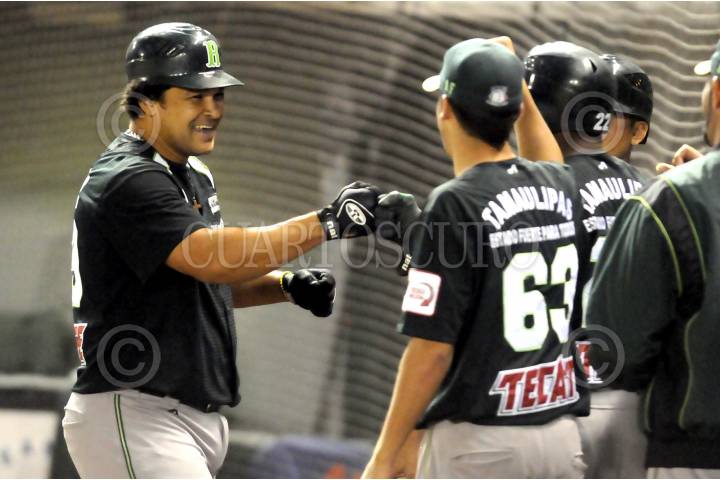 MÉXICO, D.F., 16JUNIO2011.- Willis Otañez, integrante de los Broncos de Reynosa, celebró su home run con sus compañeros, en el juego que sostuvó su escuadra contra los Diablos Rojos del México. FOTO: AGENCIA 2.8/ENRIQUE GUITÉRREZ/CUARTOSCURO.COM