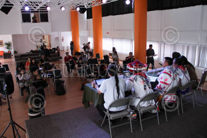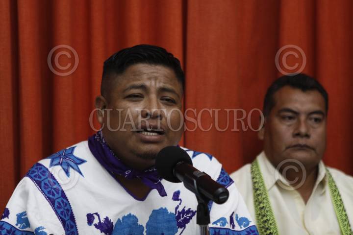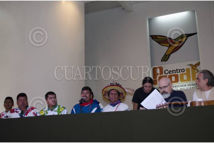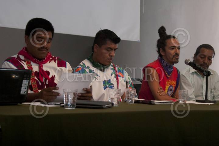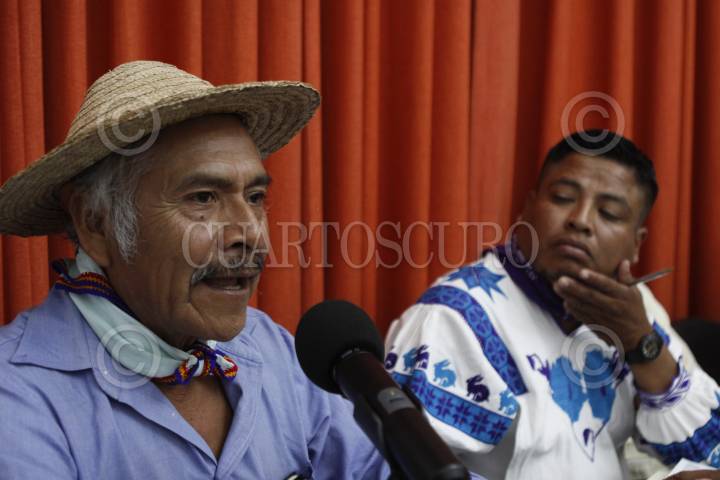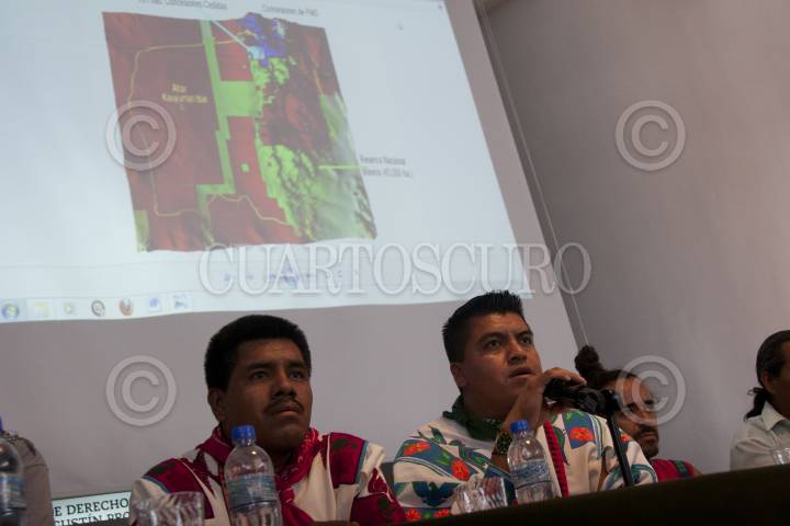 MÉXICO, D.F., 25MAYO2012.- En conferencia de prensa, representantes del Frente en Defensa de Wirikuta, acompañados de Rubén Albarran, dieron su pronunciamiento después del anuncio del gobierno federal de protección a Wirikuta. Los indígenas wirarikas consideraron que la respuesta del gobierno es incompleta y llena de datos falsos que distorsionan la realidad del lugar sagrado. Los representantes que estuvieron con el secretario de gobernación no tenían representación del pueblo wirarika y los pueblos no fueron consultados de la decisión. FOTO: ADOLFO VLADIMIR /CUARTOSCURO.COM