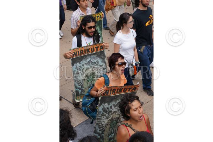 MÉXICO, D.F., 03JUNIO2012.-Integrantes del frente en defensa de Wirikuta, realizaron una manifestación de Televisa Chapultepec a el Zocalo Capitalino en protesta a las conceciones que se entregaron a la minera canadiense que se pretende acentuarse en la zona de los Huicholes en el desierto de Wirikuta. FOTO: ANA LUISA ANZA /CUARTOSCURO.COM