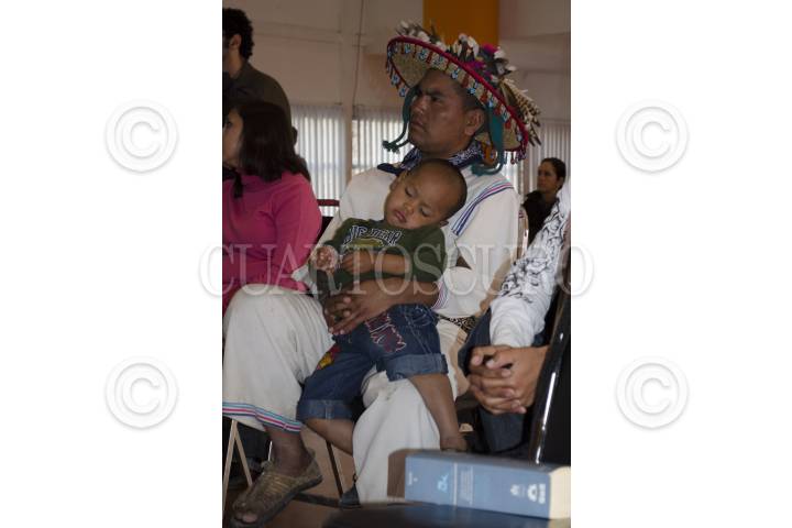 MÉXICO, D.F., 08NOVIEMBRE2012.- Un hombre huichol y su hijo durante la conferencia de prensa del Consejo Regional Wixarika, en la cual exigieron se prohíba cualquier actividad minera y se reconosca los derechos de su pueblo y de los habitantes de Wirikuta, en el Centro de Derechos Humanos Miguel Agustín Pro Juárez. FOTO: SANDRA PÉREZ /CUARTOSCURO.COM