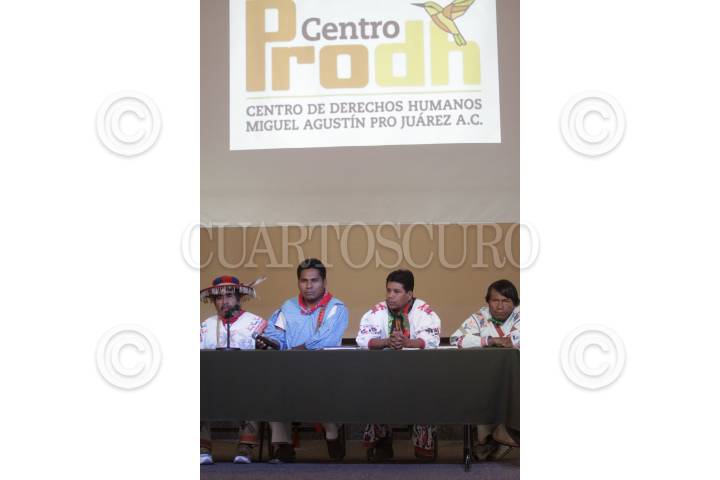 MÉXICO, D.F., 08NOVIEMBRE2012.- Lucio López Carrillo, Consejo de Vigilancia de Banco San Hipolito; J Trinidad Guzman, Representante de la Comisión de San Sebastian Teposnaguastlan; Santos de la Cruz Carrillo, Comisión del Banco San Hipolito; Pascual Pinedo, Gobierno Tradicional de Santa Catarina; Pedro De la Cruz Villa, Maraquebe Consejo de Ancianos de San Andres Cuatemate; Tumar Chavez, Moderador; Enrique Jardel Pelaez, Centro Universitario de la costa Sur de Guadalajara; Jorge Gonzalez, Movimiento por la Paz Justicia y Dignidad; durante la coferencia del Consejo Regional Wixarika en donde exigieron la prohibición de cualquier actividad minera y se reconozcan los derechos de su pueblo y de los habitantes de Wirikuta, en el Centro de Derechos Humanos Miguel Agustín Pro Juárez. FOTO: SANDRA PÉREZ /CUARTOSCURO.COM