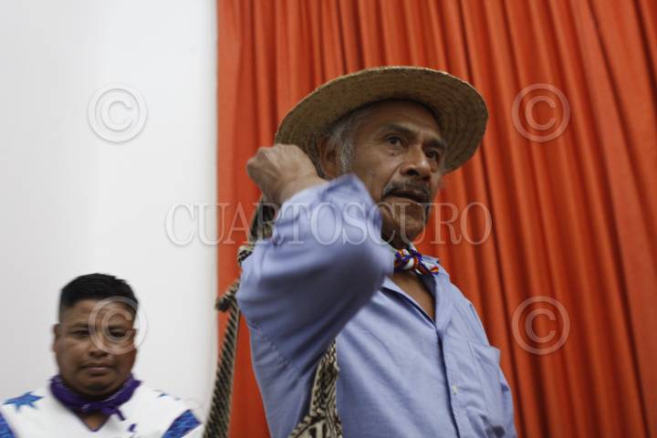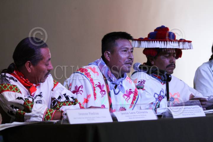 MÉXICO, D.F., 17DICIEMBRE2014.- Julián López Canaré, delegado por el Consejo Indígena Nayeri y Ubaldo Valdez, Consejo Regional Wixárika por la defensa de Wirikuta, denunciaron la violación de los derechos de los pueblos Náyeri y Wixárica en la construcción de la presa Las Cruces y las mineras en Wirikuta. Denuncian que la Conagua y la Comisión Federal de Electricidad están haciendo consultas a modo para validar el proyecto hidroeléctrico de la Cruces y la presa de La Maroma que forman parte de la infraestructura de los proyectos mineros en Wirikuta, las comunidades son objetos de presión y manipulación de la información, condicionando apoyos federales y estatales e incitando a la división y la confrontación social. por ejemplo en el caso de la presa La Maroma, la Conagua ha mentido al afirmar que este proyecto proyecto hidráulico se ubica a varios kilómetros de nuestros sitios sagrados, siendo que el embalse en realidad se encontraría totalmente dentro del Área Natural Protegida de Wirikuta. FOTO: MOISÉS PABLO /CUARTOSCURO.COM