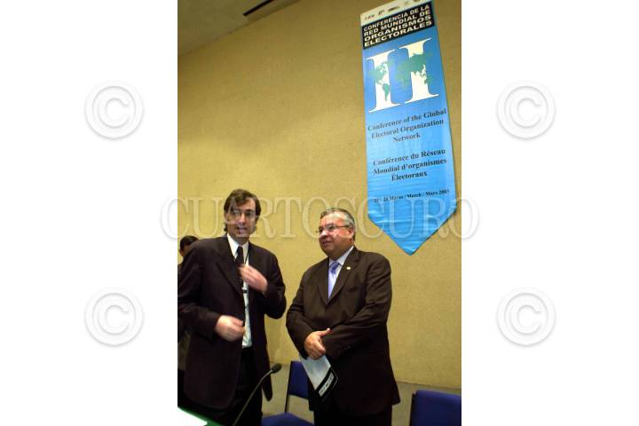 José Woldemberg y Fernando Ojesto Martínez Porcayo, presidentes del IFE y TRIFE respectivamente, durante la Inauguración de la II Conferencia Mundial de Organismos Electorales en el auditorio del IFE. FOTO: Pedro Mera/CUARTOSCURO.COM