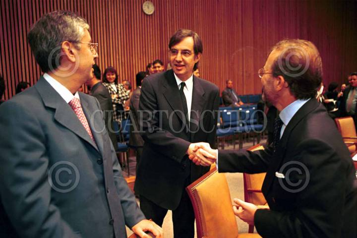 Juan Ramón de la Fuente, rector de la Universidad Autonóma de México (UNAM), José Woldemberg, presidente del Instituto Federal Electoral, y Roberto Madrazo, presidente del partido Revolucionario Institucional (PRI), durante el Foro "Manera de dialogar por México: Todos los Partidos Políticos" realizado por la UNAM en el patio central del palacio de Minería. FOTO: Eunice Adorno/CUARTOSCURO.COM