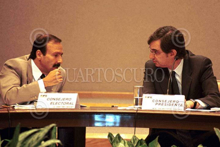 Con ocho votos a favor y una abstención el Instituto Federal Electoral (IFE) determinó multar al PRI con mil millones de pesos por no haber reportado que recibió 500 millones de pesos del sindicato de Petróleos Mexicanos (PEMEX) para la campaña de Francisco Labastida Ochoa en el 2000. En la imágen, José Woldemberg y Jaime Cárdenas, ambos consejeros del IFE. FOTO: Pedro Mera/CUARTOSCURO.COM