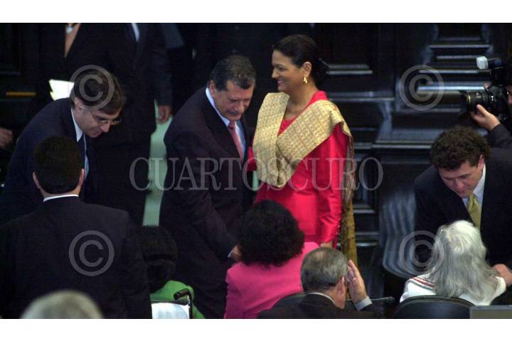 José Woldemberg, presidente del IFE, y Enrique Jackson, presidente de la mesa directiva del Senado, saludan a mujeres festejadas por el 50 aniversario del voto femenino. FOTO: Juan Pablo Zamora/CUARTOSCURO.COM