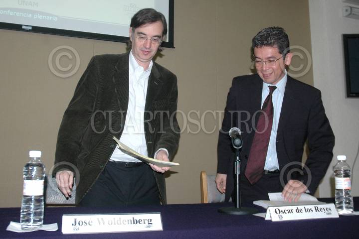 MÉXICO, D.F. 31MAYO2006.- José Woldemberg, académico de la UNAM, y Oscar de los Reyes, académico del Instituto Mora, participaron en el Coloquio Internacional "La democracia en México y América Latina: claves de lectura" que tuvo lugar en el Instituo de Investigaciones Sociales de la UNAM. FOTO: Iván Stephens/CUARTOSCURO.COM