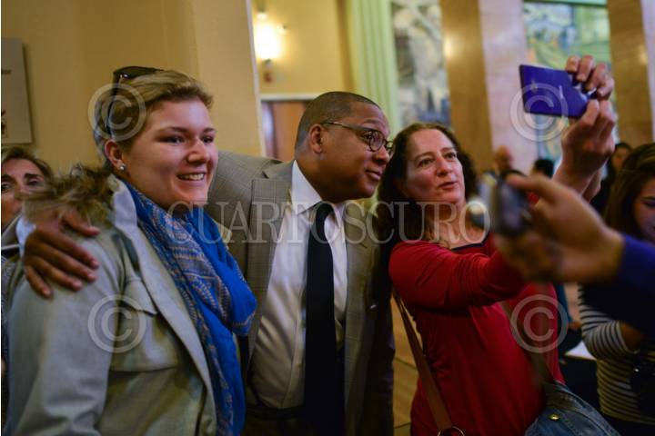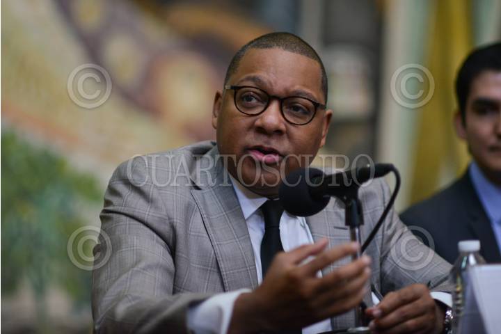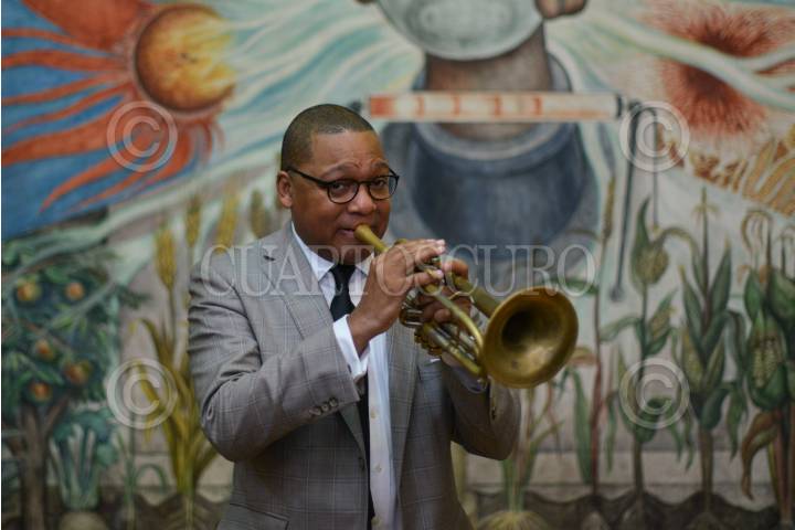 MÉXICO, D.F., 07MARZO2015.- Para el trompetista estadounidense Wynton Marsalis todos tenemos algo de blues, entendido como sentimiento y la música es la que nos ayuda a desprendernos de él, por lo que es necesario que los músicos aprendan cómo tocar el blues. Así lo indicó al ofrecer una clase magistral en el Palacio de Bellas Artes, previo a los dos conciertos que ofrecerá junto con la Jazz at Lincoln Center Orchestra, ese sábado 7 y mañana domingo 8 de marzo en el marco de la tercera edición del NY Jazz All Stars. FOTO: CONACULTA /CUARTOSCURO.COM