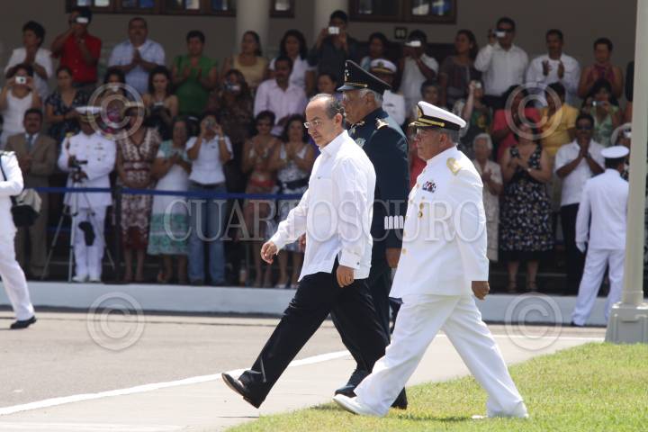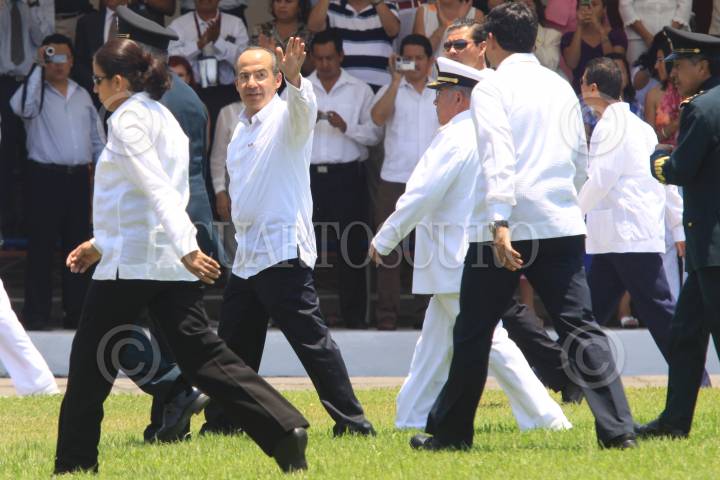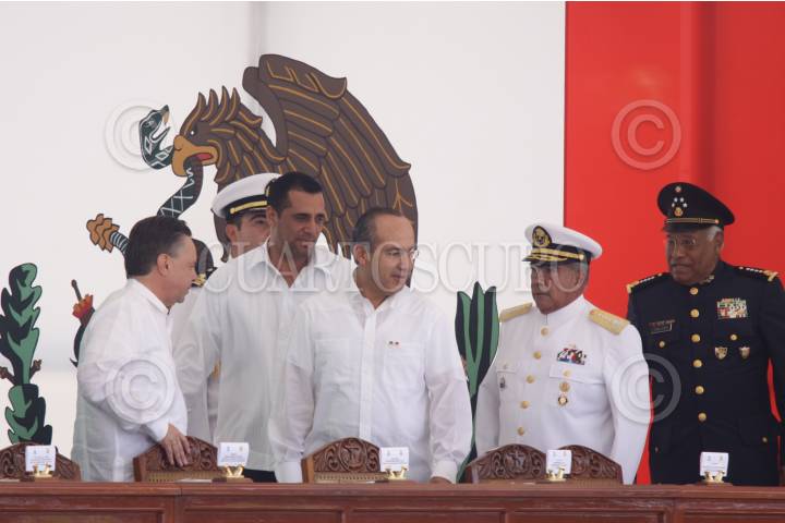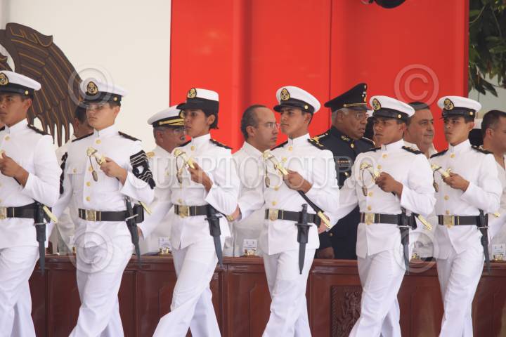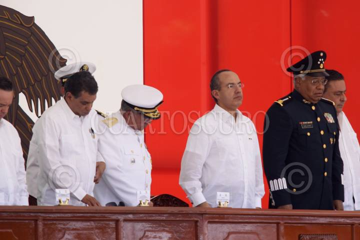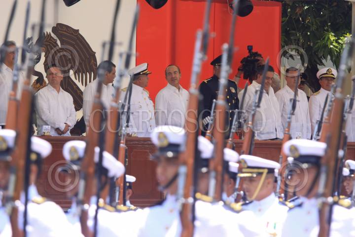 VERACRUZ, VERACRUZ 21 ABRIL2009.- Felipe Calderón Hinojosa presidente de México acompañado por el Secretario de Marina Francisco Saynez Mendoza y el Secretario de la Defensa Nacional Guillermo Galvan Galvan encabezo la Ceremonia Conmemorativa del XCV Aniversario de la Defensa del Puerto de Veracruz y Jura de Bandera de los Cadetes del Primer Año de la Heroica Escuela Naval Militar FOTO: SASHENKA GUTIÉRREZ/CUARTOSCURO.COM