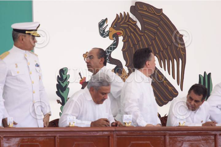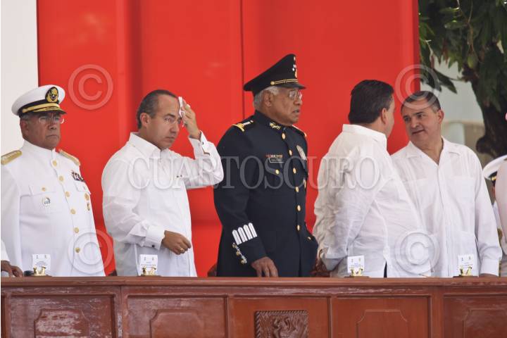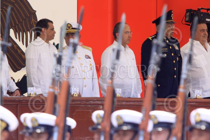 VERACRUZ, VERACRUZ, 21ABRIL2009.- Fidel Herrera Beltrán, gobernador del estado; Mariano Francisco Saynez, secretario de Marina; Felipe Calderón Hinojosa, presidente de México y Guillermo Galvan Galvan, secretario de la Defensa Nacional, durante la Ceremonia Conmemorativa del XCV Aniversario de la Defensa del Puerto de Veracruz y Jura de Bandera de los Cadetes del Primer Año de la Heroica Escuela Naval Militar FOTO: SASHENKA GUTIÉRREZ/CUARTOSCURO.COM