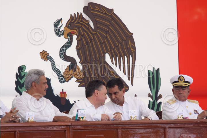VERACRUZ, VERACRUZ, 21ABRIL2009.- Alberto Cárdenas Jiménez, secretario de Agricultura, Desarrollo Rural, Pesca y Alimentación; Eduardo Medina Mora, procurador General de la República; Fidel Herrera, gobernador del Estado y Francisco Saynez Mendoza, secretario de Marina durante la Ceremonia Conmemorativa del XCV Aniversario de la Defensa del Puerto de Veracruz y Jura de Bandera de los Cadetes del Primer Año de la Heroica Escuela Naval Militar FOTO: SASHENKA GUTIÉRREZ/CUARTOSCURO.COM