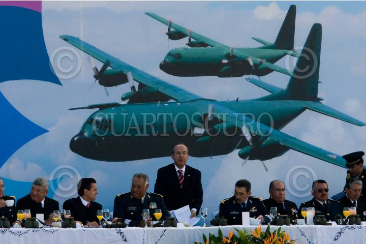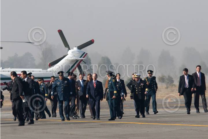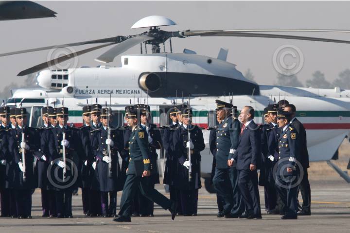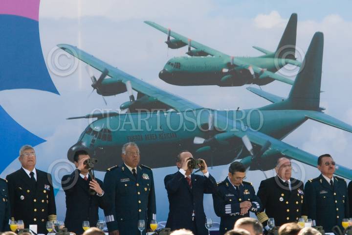 TECÁMAC, ESTADO DE MÉXICO, 10FEBRERO2010.- Felipe Calderón Hinojosa, Presidente de México, acompañado de Enrique Peña Nieto, Gobernador del Estado de México, Guillermo Galván Galván, Secretario de la Defensa Nacional y Leonardo González García, Comandante en Jefe de la Fuerza Aérea de México y Francisco Saynez Mendoza, titular de la Secretaria de Marina, encabezaron la ceremonia conmemorativa del “XCV Aniversario de la Fuerza Aérea Mexicana”, en la base aérea de Santa Lucia. FOTO: GUILLERMO PEREA/CUARTOSCURO.COM