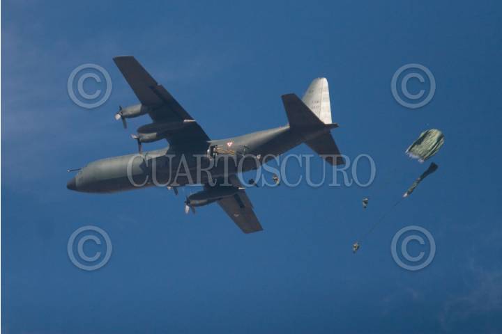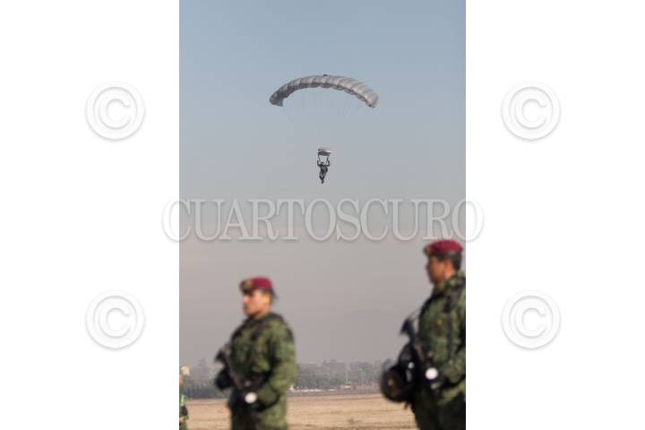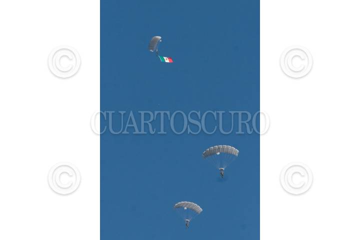 TECÁMAC, ESTADO DE MÉXICO, 10FEBRERO2010.- Elementos de la Fuerza Aérea Mexicana, realizaron una exhibición con fusileros en paracaídas, esto en el marco de la ceremonia conmemorativa del “XCV Aniversario de la Fuerza Aérea Mexicana”, en la base aérea de Santa Lucia, el Jefe Máximo de las Fuerza Armadas y sus secretarios presenciaron este espectáculo. FOTO: GUILLERMO PEREA/CUARTOSCURO.COM