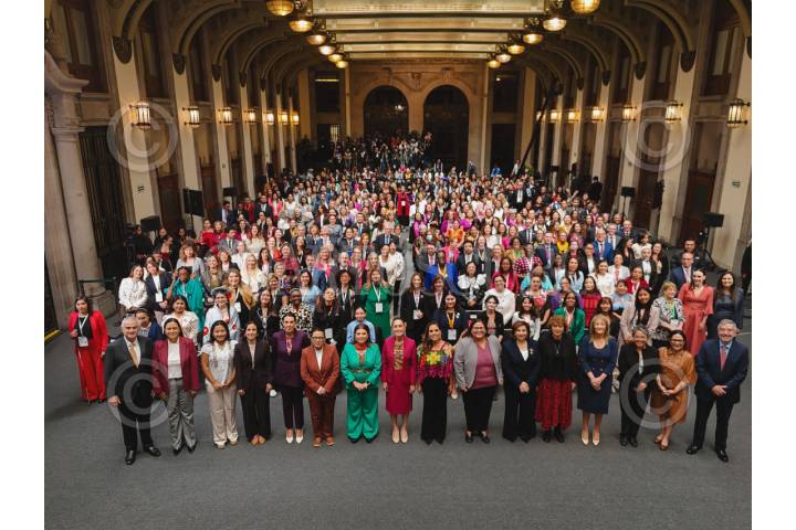 CIUDAD DE MÉXICO, 12AGOSTO2025.- Claudia Sheinbaum, presidenta de México, encabezó la inauguración de la XVI Conferencia Regional sobre la Mujer de América Latina y el Caribe, evento realizado en el salón Tesorería de Palacio Nacional. La acompañan: Juan Ramón de la Fuente, secretario de Relaciones Exteriores; Clara Brugada, jefa de Gobierno; Citlalli Hernández, secretaria de las Mujeres; Rosa Icela Rodríguez, secretaria de Gobernación; Raquel Buenrostro Sánchez, secretaria Anticorrupción y Buen Gobierno; Rosaura Ruiz Gutiérrez, secretaría de Ciencia, Humanidades, Tecnología e Innovación; Josefina Rodríguez Zamora, secretaria de Turismo; Luz Elena González, secretaria de Energía, y Ariadna Montiel, secretaria del Bienestar. FOTO: PRESIDENCIA/CUARTOSCURO.COM